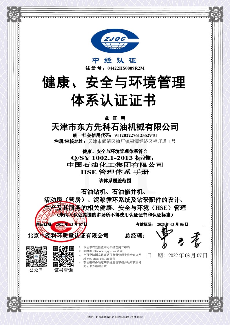 健康、安全與環(huán)境管理體系認證證書